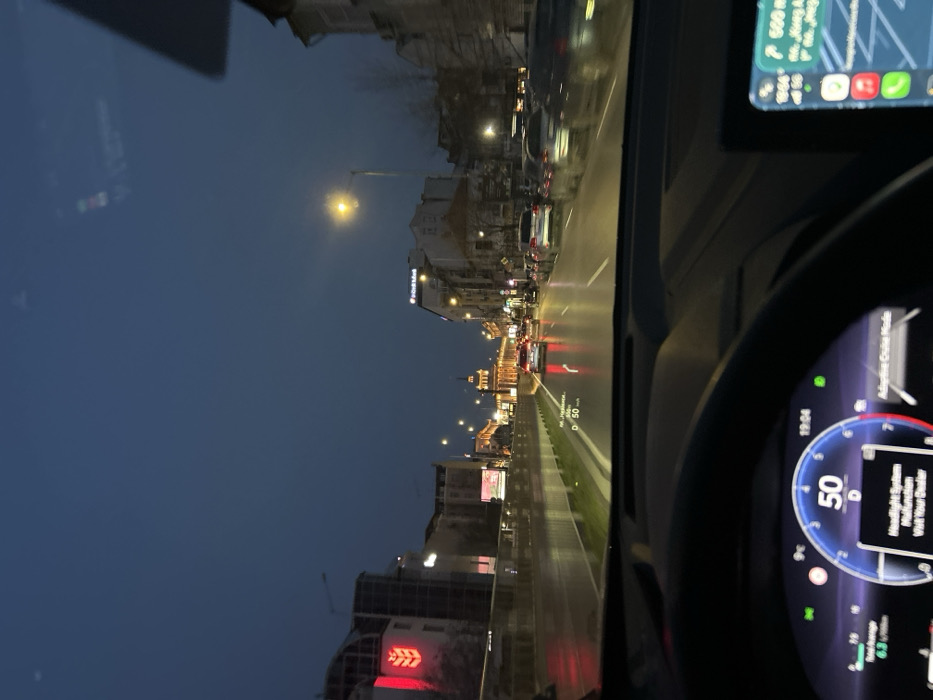 A nighttime or twilight street scene in Sofia, Bulgaria, captured from the interior of a moving vehicle. The environment is urban, characterized by multi-story buildings, streetlights, and moderate vehicle traffic. **Vehicle Interior:** The perspective is from the driver's seat. A digital instrument cluster is visible at the bottom left, displaying a speed of "50" (likely km/h), the letter "D" for drive, and the time "19:04". A warning message, "Headlight System Malfunction Visit Your Dealer," is present on the display. Below the speed, "Real Average 6.3 L/100km" is shown. "Adaptive Cruise Mode" is also indicated. Part of a dark-colored steering wheel occupies the lower foreground. To the right, a vertical infotainment screen displays what appears to be a navigation interface (likely Apple Maps), showing a route and a distance of "500 m". A Head-Up Display (HUD) projection on the windshield shows "50 km/h" and an arrow, indicating navigation guidance. **Road and Traffic:** The road ahead is a multi-lane urban thoroughfare, appearing wet, suggesting recent precipitation. Vehicle taillights are visible in the distance, indicating traffic. The vehicle is in the leftmost lane for its direction of travel. **Surrounding Environment:** * **Left side:** A prominent building with a large, illuminated red sign featuring a stylized wheat stalk logo (identifiable as a Sopharma Group establishment, likely Sopharmacy) is visible. Further down the street, other buildings with various lighting are present. * **Right side:** Buildings with more traditional architecture line the street. A "UniCredit Bulbank" sign is visible on one of these buildings. Streetlights illuminate the scene. * **Distant view:** In the distance, the grand, illuminated complex known as the **Largo** is clearly identifiable, specifically the **Council of Ministers building** with its distinctive dome, flanked by other significant governmental structures. **Location:** The scene is located on **Tsar Osvoboditel Boulevard in Sofia, Bulgaria, looking west towards the Largo complex (Council of Ministers and Presidency buildings).**