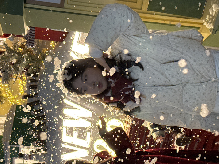 The scene depicts a festive environment in Liangjiang, China, under artificial snowfall. A young East Asian female, positioned slightly right of center, is the primary subject. She wears a light-colored puffer jacket with a subtle pattern, a dark red scarf, and light pants. Artificial snow is visible on her dark hair, jacket, and scarf. Her lips are pursed in a slight pout, and her gaze is directed towards the left. Her right arm is bent with her hand near her right ear, forming a pose. To her left, a second individual is partially visible, wearing a dark red garment, with an arm extended forward. In the background, large, bright, illuminated letters spell "NEW" and partially visible "23". Further back, an artificial Christmas tree adorned with warm lights and what appears to be a red Christmas stocking are visible, suggesting a holiday theme. The entire frame is filled with numerous white specks, indicating simulated falling snow, which is also settled on the subjects and foreground elements.