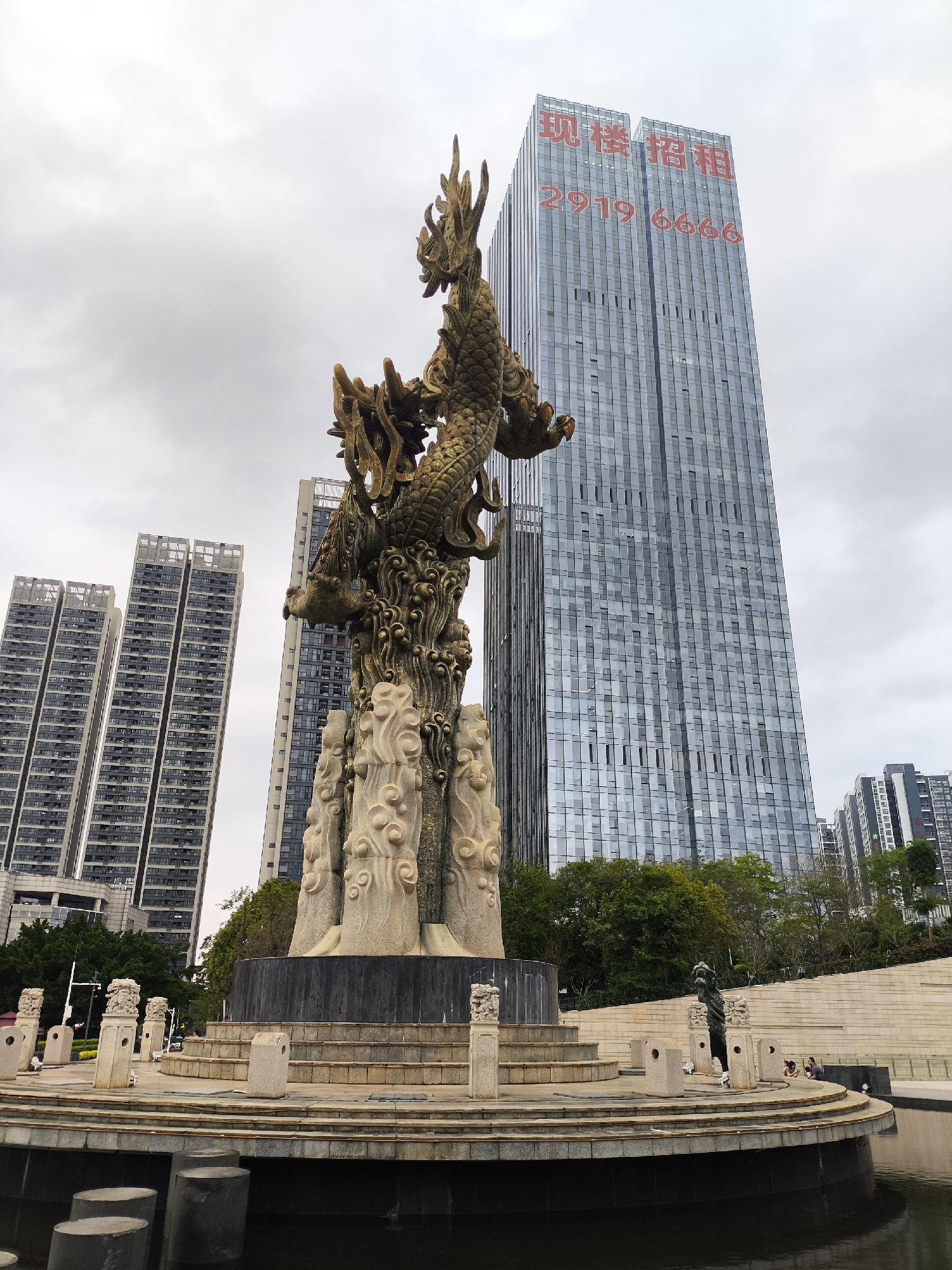 The image depicts a bronze dragon statue as its centerpiece in a public area located in Longgang District, China. The statue sits on a multi-tiered stone base encircled by a shallow, possibly artificial, pond. Additional stone structures and decorative elements border the pond. Several high-rise buildings form the backdrop, the nearest one, a modern glass-clad skyscraper, features large red Chinese characters on the top half, with a phone number beneath. The sky overhead is overcast. In the background, a few people are visible near some other greenery.