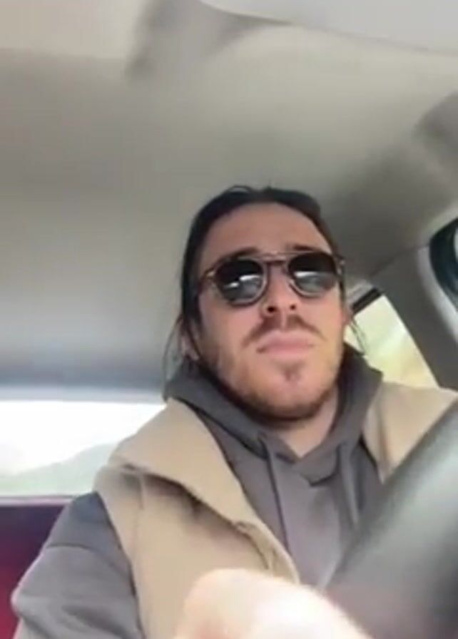 person with shoulder-length hair, wearing sunglasses, a gray hoodie, and a cream-colored vest, driving a car. The camera is positioned inside the car, facing the driver. The car's interior is visible, including the steering wheel, ceiling, and a red seat. The person appears to be looking forward, driving the car. Music can be heard in the background.