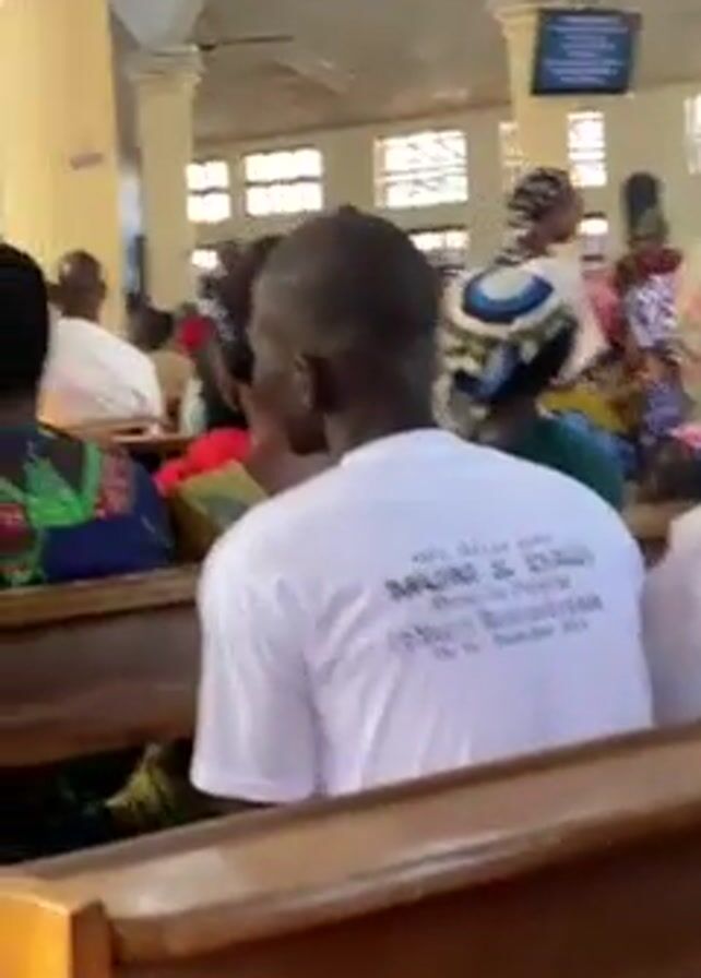 The interior of a church filled with seated attendees is shown. People are wearing various garments, including shirts with printed messages. A TV screen displays information at the front of the room. The church has wooden pews and tall columns. Music is playing.