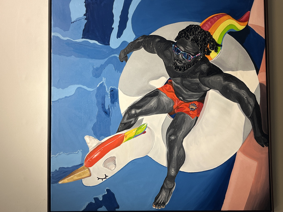 This image depicts a framed contemporary painting showcased on a white gallery wall. The painting features a dark-skinned individual with a textured, sculptural black complexion, floating supine on a large, white inflatable unicorn pool float. The individual wears bright orange swim trunks with a yellow and red starburst emblem on the left thigh, blue-framed sunglasses, and has a voluminous black curly afro from which a vibrant rainbow-colored stream emanates. The unicorn float has a golden horn with a red tip and a matching rainbow-colored mane section. The background is an abstract depiction of water in various shades of blue, suggesting ripples and depth, with a muted pink/orange element visible at the lower-left edge. The painting is located at Gallery 1957, Accra, Ghana.