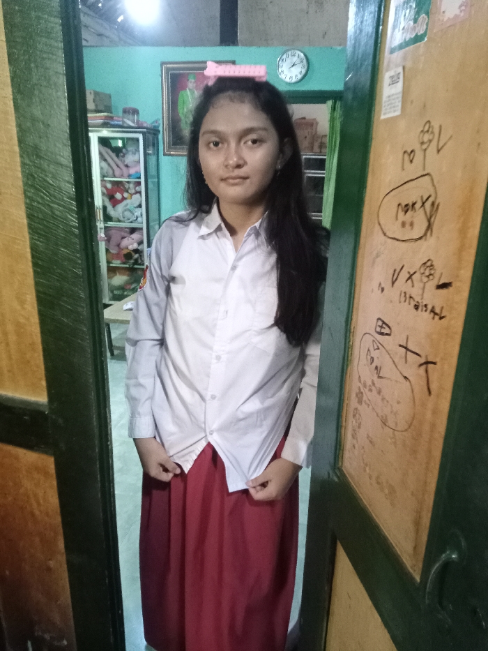 A young person with long, dark hair and a pink clip on their head stands framed by a doorway