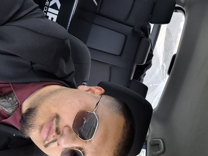 A man is depicted in a close-up, chest-up shot, taken from a low angle inside a vehicle