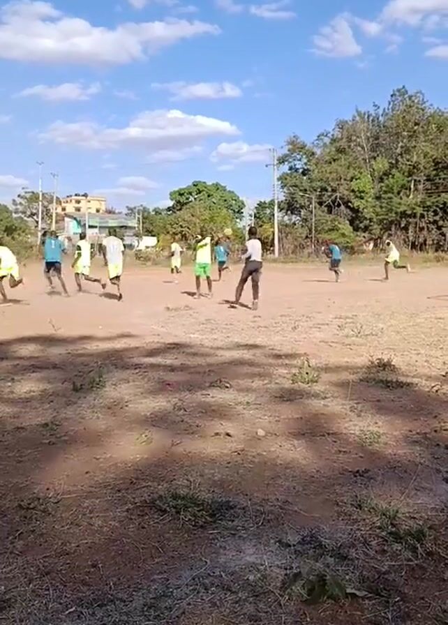 A video depicts a group of young people playing a game of soccer on a dirt field, under a blue sky with scattered white clouds