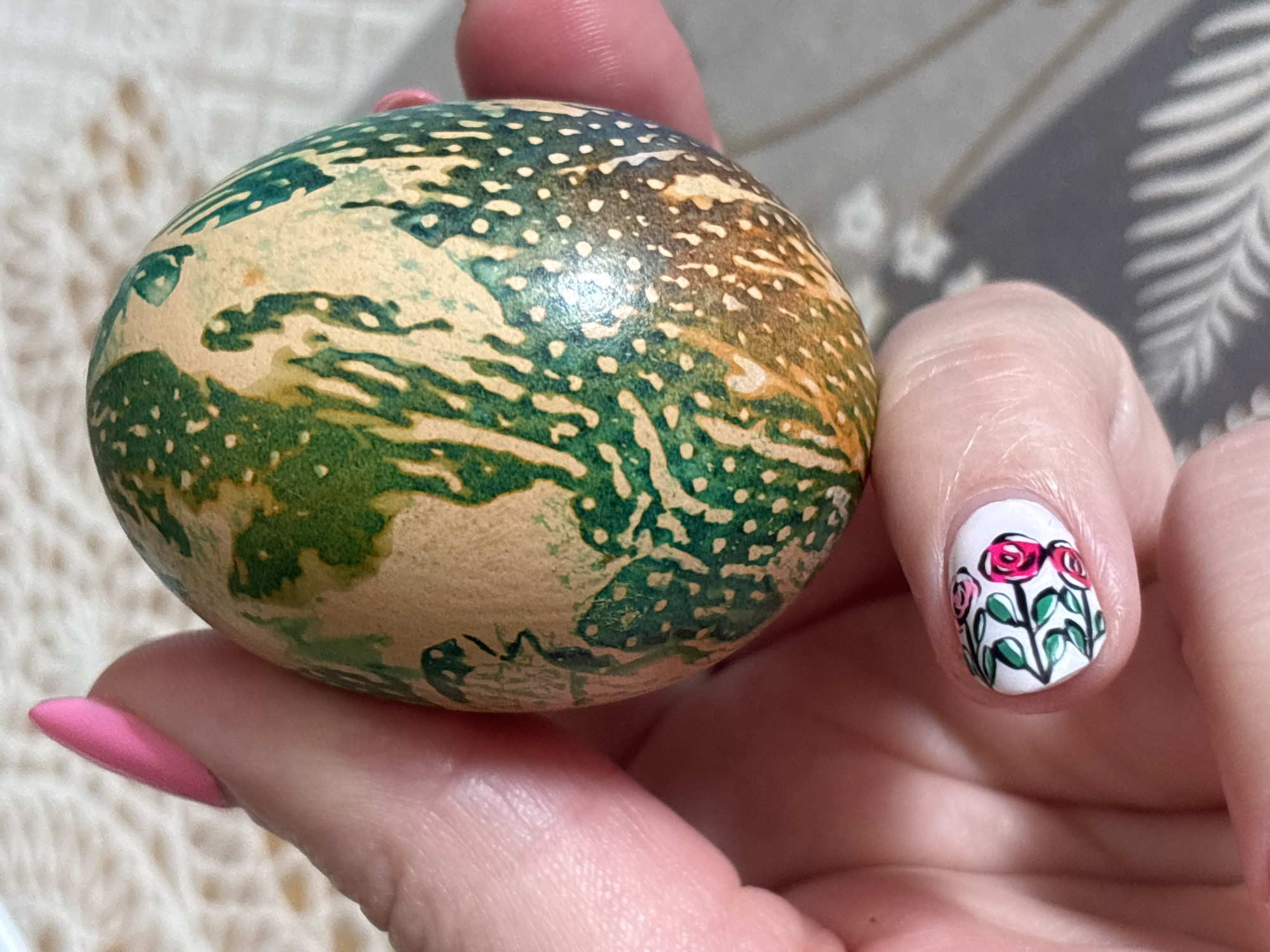 A person holds a decorated egg in their hand. The egg is round and features a mottled pattern of beige, green, and brown hues, dotted with small white spots. The person's skin is light-toned, and the fingernails are painted pink, except for the ring fingernail, which has a white base with a hand-painted design of roses with black stems and green leaves. The background consists of a blurred patterned surface, likely a table or textile. The location is inferred to be Aidemir, Bulgaria.
