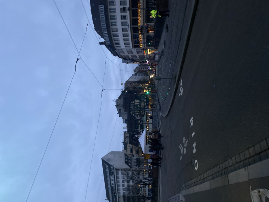 An urban street scene on an overcast day. Buildings line the street, some with distinctive half-timbered architecture. Wires crisscross the sky. People are gathered near a white tent. Markings for bicycles are visible on the street. A figure in a bright uniform stands on the sidewalk. Decorations and lights adorn some buildings. Tram tracks run along the road.