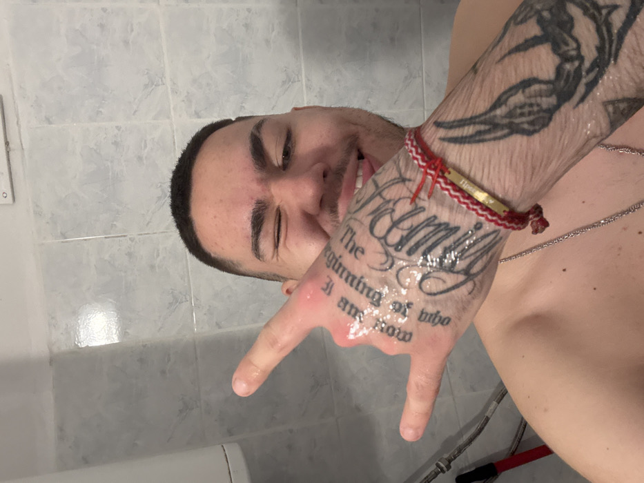 An adult male is depicted indoors, in what appears to be a bathroom in Yambol, Bulgaria. He is positioned against a background of light blue-grey square tiles. The subject's right eye (viewer's left) is closed in a wink, while his left eye is open. He is smiling with his tongue extended slightly. His right hand (viewer's left) is raised, forming a "rock on" gesture with the index and pinky fingers extended. Water droplets are visible on the skin of his raised hand. The subject has extensive black ink tattoos on both hands and forearms, including script on the back of the right hand and a large, dark design on the right forearm. A red and white braided bracelet with a small gold-colored rectangular plaque is worn on his right wrist. He appears shirtless, with a silver chain visible around his neck. A white cylindrical object and metal piping are partially visible on the left side of the frame.