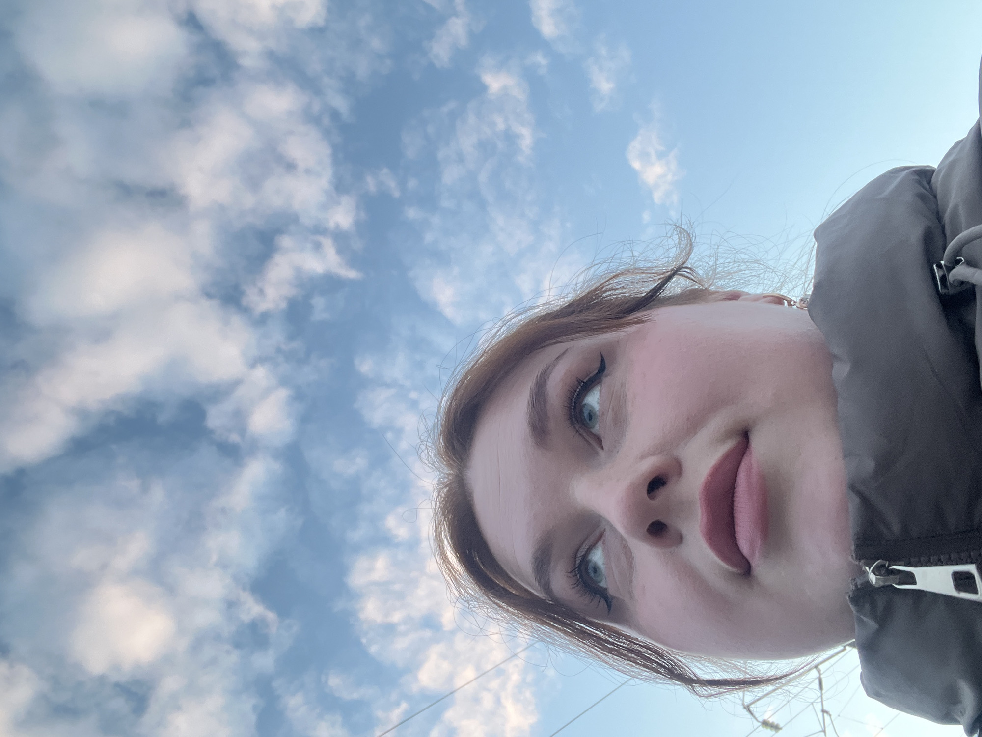 An upward-angled close-up shot of a young adult female on a clear day in Павловка, Russia. The subject's head and upper torso are visible, with her face occupying the lower portion of the frame, looking intently upwards and slightly to the viewer's left. She has fair skin, reddish-brown hair (pulled back), light blue eyes enhanced with dark eyeliner and mascara, and pink-toned lips. She is wearing a dark grey or olive-green puffer jacket with a visible silver zipper at the neckline. The background consists predominantly of a bright blue sky with scattered white cumulus clouds. Faint utility wires are discernible in the upper left quadrant of the image. The scene is illuminated by natural daylight.