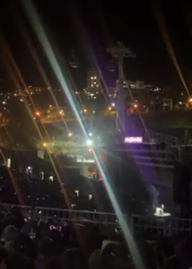 crowded outdoor concert at night. The concert stage is illuminated with bright lights, and a large screen displays the word "Euphoria". The audience is packed tightly together, with many people holding up their phones to record the performance. A cable car is visible in the background, carrying people across the city. The city lights can be seen in the distance.