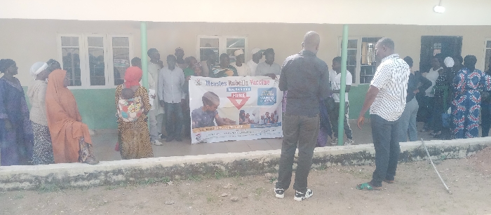 A group of people stand in front of a building with a "Measles Rubella Vaccine" banner