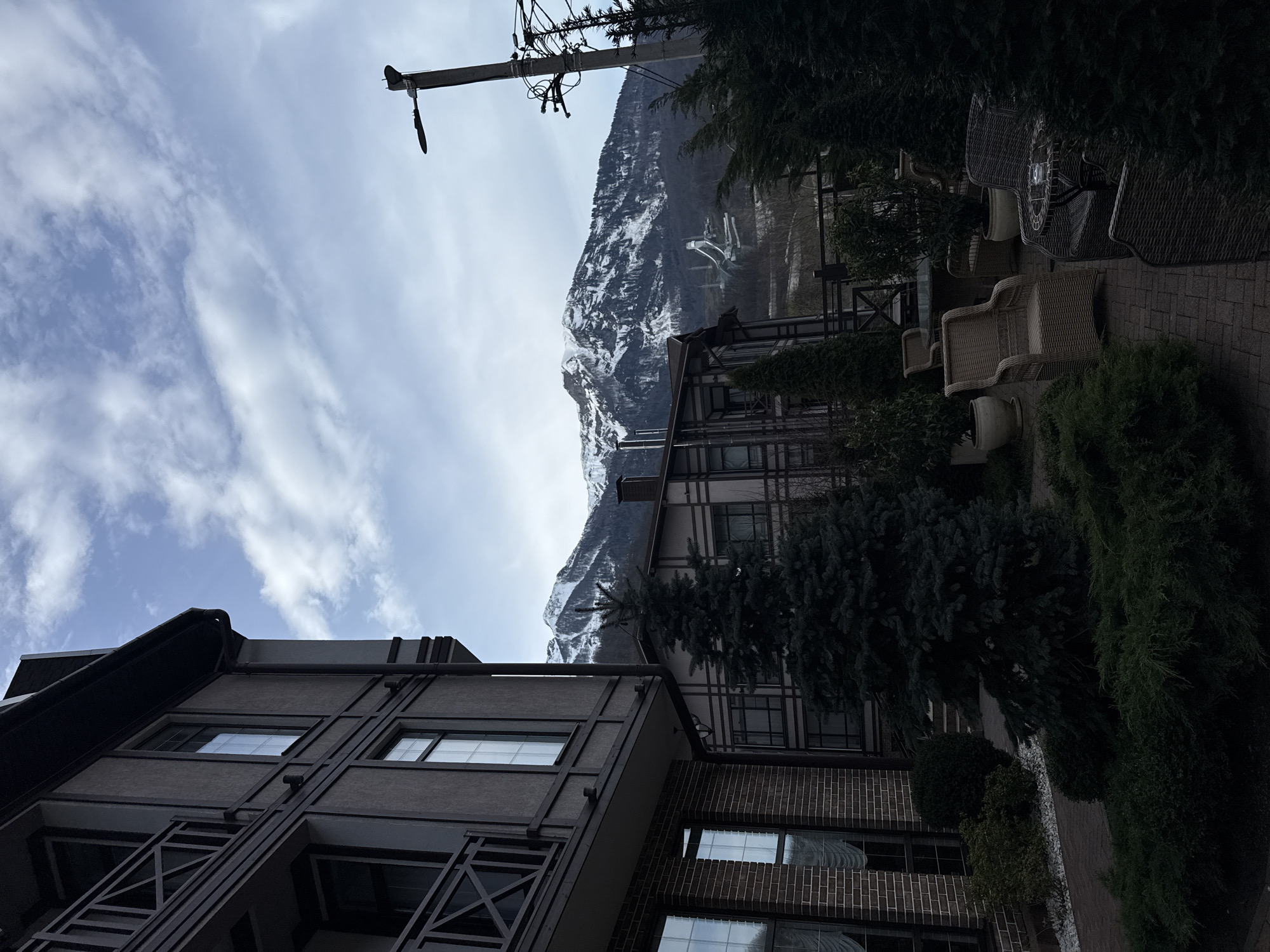 view in Estosadok, Russia, with buildings and a mountain in the background. The architecture includes multi-story buildings with a mix of brick and stucco facades. Windows are rectangular. A power line pole is visible in the upper part of the frame, with the mountain partially covered in snow under a cloudy sky. The foreground features foliage and outdoor seating, including wicker chairs. The overall scene is somewhat dark.