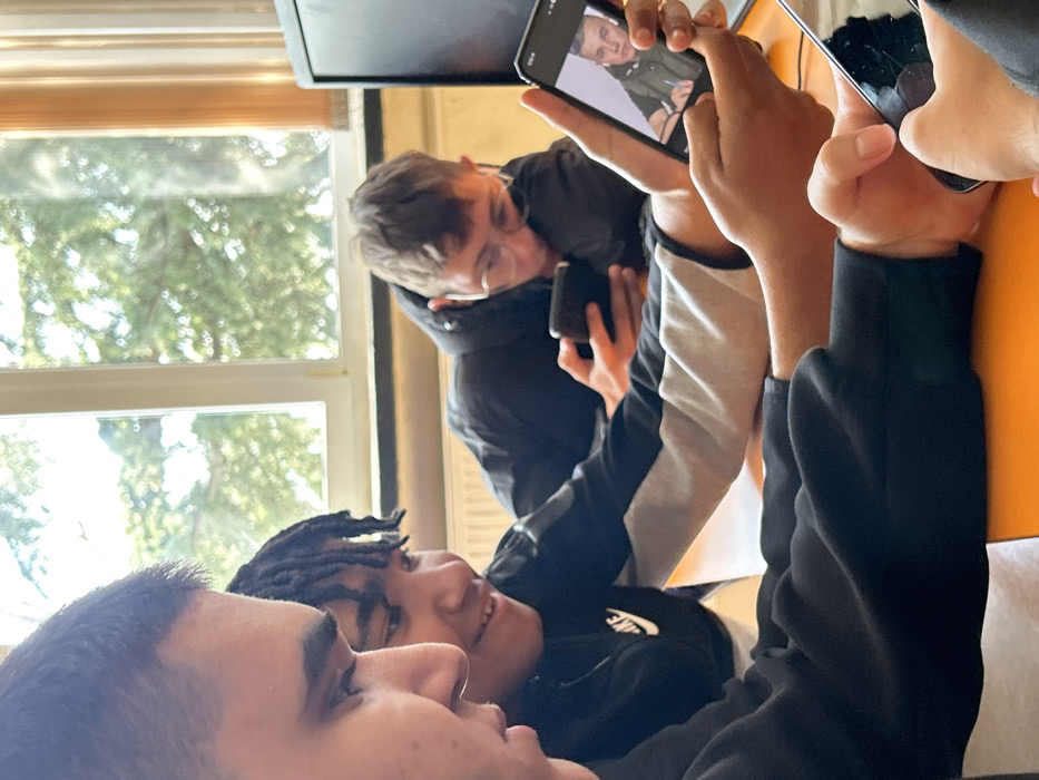 The image depicts an indoor scene, brightly illuminated by natural light entering through a large multi-pane window in the background. Four young individuals, predominantly male, are seated around an orange table, each engaged with a mobile phone. In the foreground left, a person with dark hair is partially visible in profile, holding a black smartphone with a visibly cracked screen in their right hand, resting on the orange table. Immediately to their right, a male with dark skin and dreadlocks is smiling, looking down and to the right. He wears a black and grey long-sleeved shirt featuring a white "NIKE" logo. Further to the right, a third male, identified by light skin, short light-brown hair, and clear-rimmed glasses, wears a black puffer jacket. He is leaning on the table, intently focused on a black smartphone held in his right hand. A fourth hand, positioned in the far foreground right, holds a black smartphone displaying a portrait image of a young male with light hair, wearing a dark green jacket and holding a pen. The background features the aforementioned large window, through which blurred green foliage is visible. A white radiator is situated directly below the window. Partially visible on the right side of the background are a black computer monitor and light-colored curtains. No explicit visual identifiers within the image confirm its location as Kazanlak, Bulgaria.