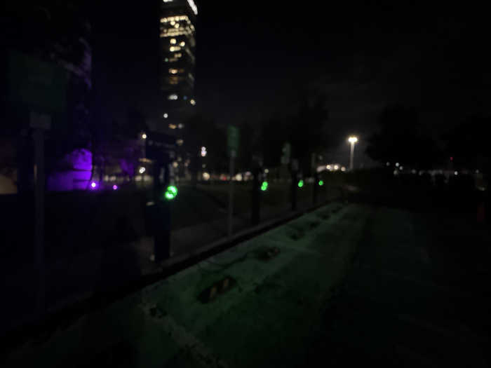 The image presents a nighttime outdoor scene in Heroica Puebla de Zaragoza, Mexico. The foreground features a dark green-colored paved pathway or lane, exhibiting indistinct rectangular markers or speed bumps. Along the left side of this pathway, a series of at least five dark, vertical structures, possibly bollards, are positioned. Each of these structures emits a distinct circular green light. To the immediate left of these green-lit bollards, a landscaped area or park section is illuminated with diffuse purple light, revealing blurred forms of vegetation. In the background, a tall, multi-story building with multiple illuminated windows rises against the dark sky. Further into the distance, several blurred white lights, consistent with streetlights, are visible, along with other indistinct red and white light sources, suggesting a wider urban environment. The sky above is dark and cloudless. No individuals or vehicles are present in the frame, and no specific actions or interactions are depicted. The scene is illuminated primarily by artificial light sources, resulting in areas of deep shadow and focused illumination.