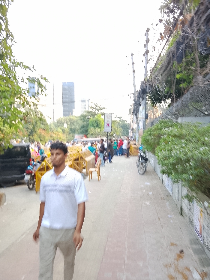 An outdoor scene in Dhaka, Bangladesh, depicts an urban street and sidewalk under bright, possibly hazy, daylight. In the immediate foreground, a male individual with dark hair and a light complexion walks away from the camera on a paved sidewalk, wearing a white striped polo shirt and light-colored pants. His gaze is directed slightly to the left of the camera's perspective. In the mid-ground, a gathering of approximately 20-30 individuals is visible behind a series of yellow, portable road barriers. Some of these individuals are wearing brightly colored clothing, including red and blue. Several light-colored chairs, possibly plastic, are positioned near these barriers. To the left of the scene, a dark-colored vehicle, appearing to be a van or SUV, is parked, with a motorcycle visible beside it. The right side of the image features a sidewalk running parallel to a wall covered with numerous posters or flyers. Above the wall, dense green foliage and bushes are present. A series of utility poles laden with a tangled network of wires are prominent along the right edge of the frame. In the background, several multi-story buildings are visible against a bright, expansive sky, with one tall, dark-colored high-rise building standing out prominently. Green trees line the street, partially obscuring the distant buildings.