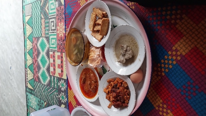 A tray laden with dishes rests on a vibrant patterned mat. Soup with vegetables is in an oval-shaped bowl, accompanied by fried tempeh. A small pile of crackers sits nearby. A dish contains meat in a creamy white sauce, while another offers meat in a red sauce. There's also a plate of dark, possibly fried, meat pieces. A whole egg also sits on the tray.