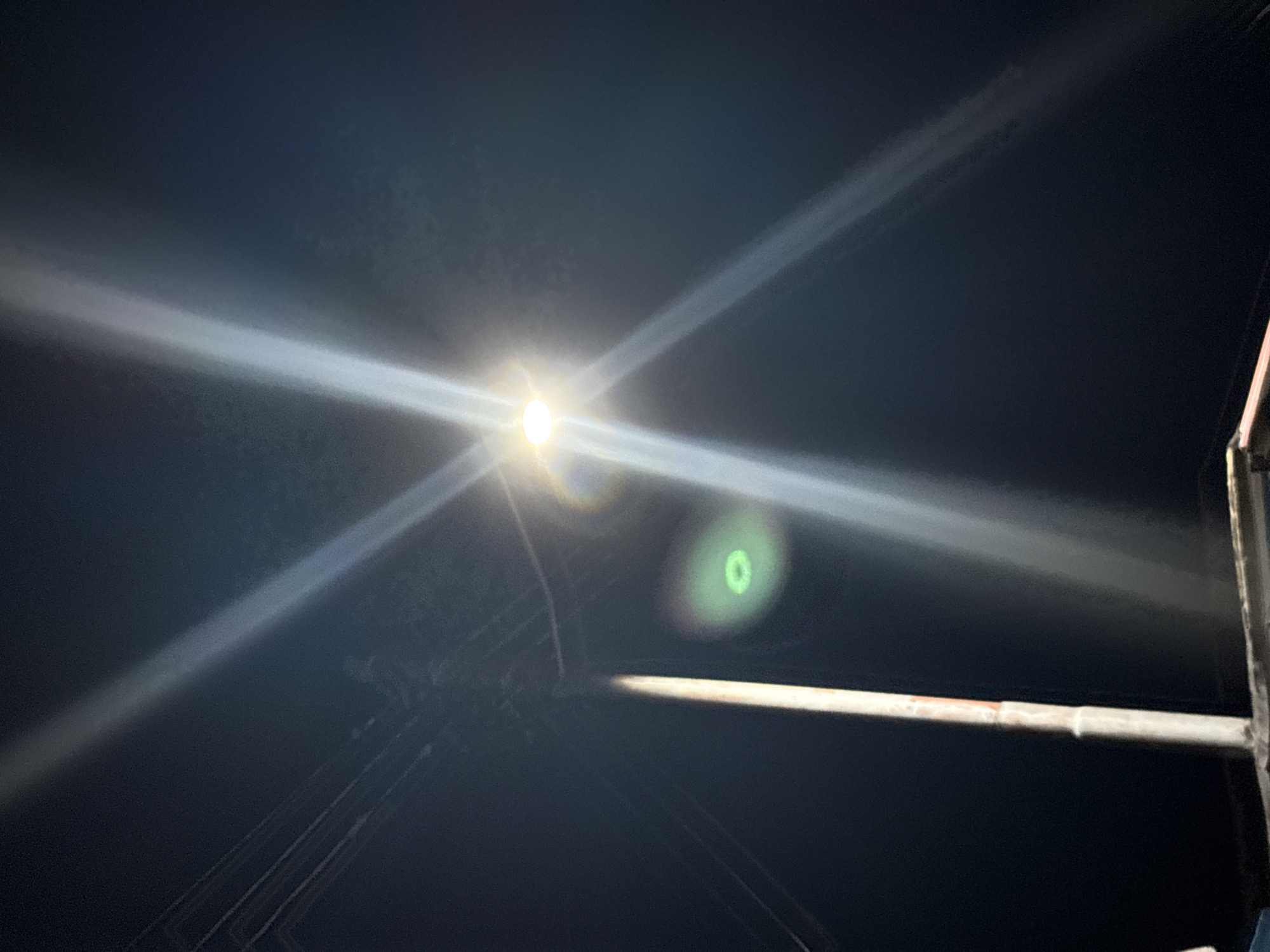 nighttime scene in Taguanes, Venezuela. A bright light source, likely a street lamp, dominates the center of the frame. The light creates a strong glare and lens flare effect, with beams radiating outwards. Below the light source are power lines. A white cylindrical object, possibly a pipe, is visible in the lower right quadrant of the image. The background is dark, suggesting a night sky or obscured structures. No people are visible in the scene.