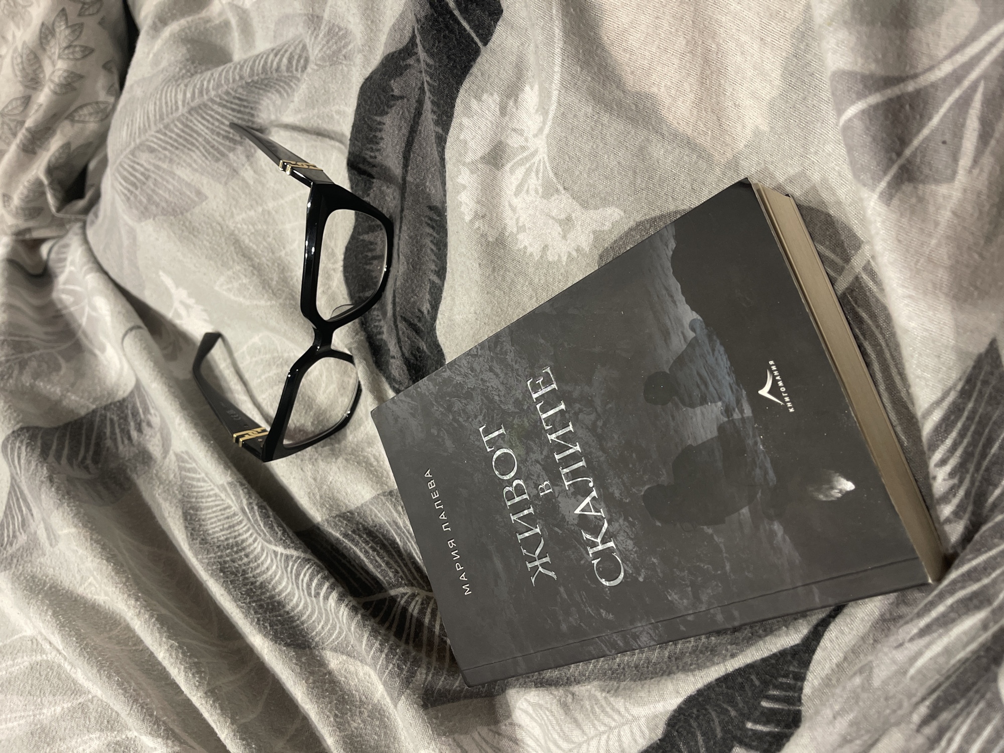 On a bed with a gray and white patterned duvet, a pair of black-framed glasses rests near a book titled "Живот в скалите" (Life in the Rocks) by Maria Laleva