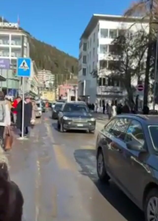 street scene on a sunny day. There are people walking on a sidewalk and cars driving on a wet, slushy street. A dark gray BMW SUV with a roof rack is driving towards the camera, followed by other vehicles. There is a pedestrian crossing sign. Buildings are visible in the background, along with a hillside covered with trees.