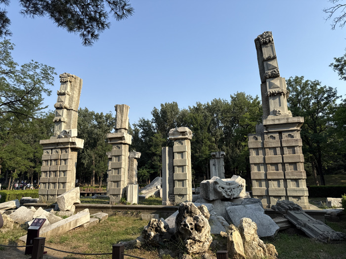 Ruins stand amidst a grassy field under a bright blue sky. Several tall, weathered stone columns with intricate carvings are partially intact, while others are broken and scattered on the ground. Trees surround the ruins, creating a natural backdrop. The scene evokes a sense of history and decay. A small sign is visible near the front, suggesting it may be a historical site.
