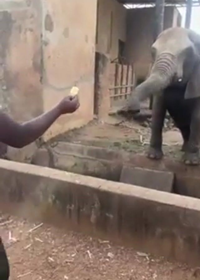 The video depicts a woman feeding an elephant at what appears to be a zoo or sanctuary