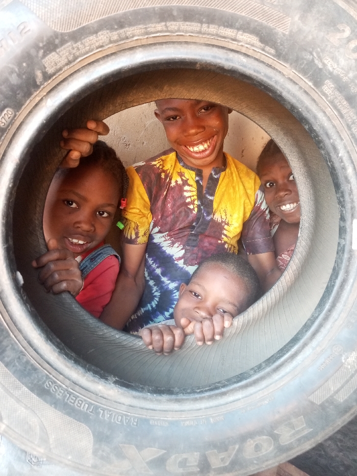 In Tempure, Nigeria, four children are observed positioned within the central opening of a large, dark rubber tire