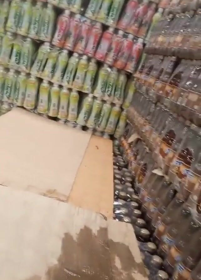 The video depicts a storage area or warehouse containing stacks of bottled beverages