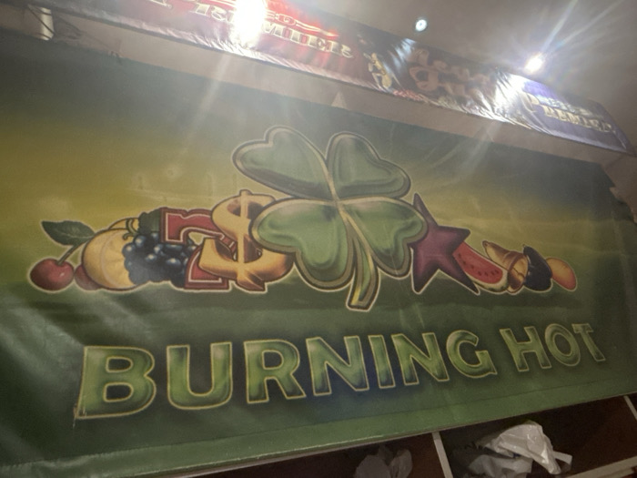 An indoor scene in Ihtiman, Bulgaria, features a prominent green banner stretched across the frame, bearing promotional graphics and text. The banner displays a central glossy four-leaf clover. To its left, stylized illustrations include a red cherry, a yellow lemon, blue grapes, a red number '7', and a golden dollar sign. To the right of the clover, a purple five-pointed star and assorted fruits, including a watermelon slice, are depicted. Below this imagery, the words "BURNING HOT" are rendered in large, glossy green block letters. Above the green banner, a partially visible, darker blue and red banner displays indistinct light-colored text and graphics, heavily obscured by glare from an overhead light source. Below the green banner, a dark shelf or surface holds several crumpled white plastic bags or pieces of paper. No individuals are present in the scene.