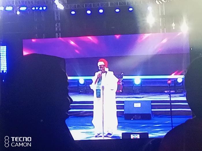 A person in a white robe and red hat stands on a stage, speaking into a microphone. A large screen behind them displays an abstract image. The stage is illuminated by bright lights. Two blurred figures are in the foreground, appearing to be part of the audience. The words "TECNO CAMON" are visible in the lower left corner. The overall impression is of a performance or presentation taking place.