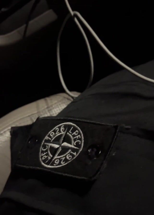 A brief video starts with a close-up view of a Stone Island badge on a dark garment