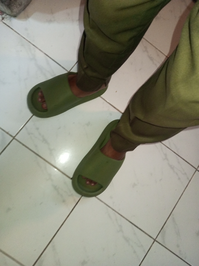 A person wearing olive green sweatpants and matching slides stands on white tile. The slides are a simple, slip-on style with an open toe. The floor is clean and brightly lit, with a grid pattern from the tiles. The person's feet are visible within the slides. The overall image has a casual, relaxed feel.