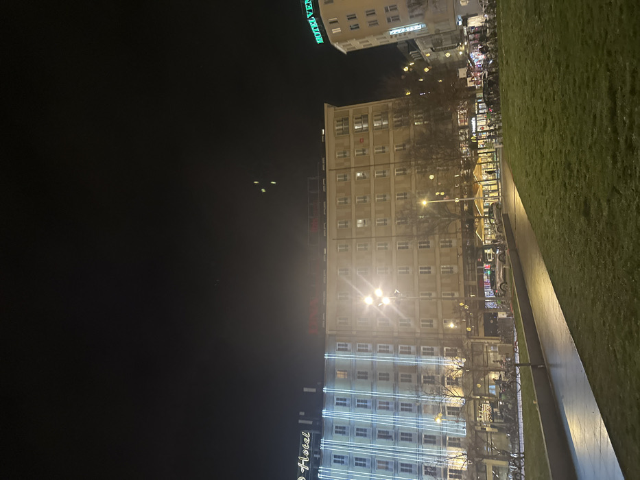 A nighttime view features tall buildings illuminated by streetlights. A dark sky dominates the left side of the frame, while the right side shows a grassy area. The buildings are multi-story structures with rows of windows. Some trees are visible along the street, and pedestrians and vehicles are blurred due to the long exposure. A sign for a hotel is partly visible.