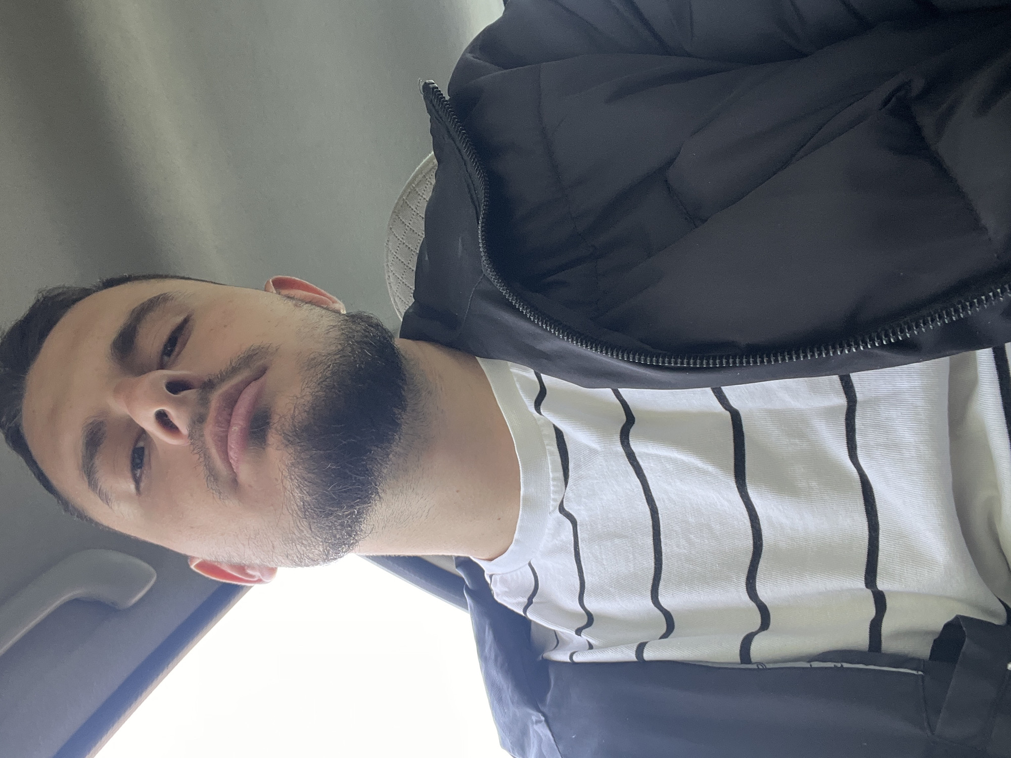 A medium-shot, high-angle photograph shows a man wearing a black, puffy jacket over a white t-shirt with thin, vertical black stripes. The background is blurred, appearing to be the interior of a vehicle. The photograph does not contain enough information to determine the location in the city of Burgas, Bulgaria.