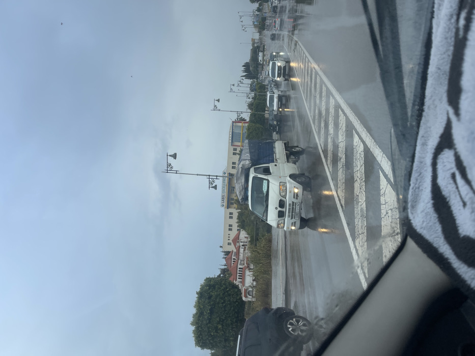 The image depicts a rainy daytime street scene in Meknes, Morocco. The view is captured from inside a vehicle, with part of the dashboard and a black-and-white striped fabric cover visible in the foreground. The asphalt road is wet and reflective, showing white pedestrian crossing markings in the immediate foreground. In the mid-ground, a white small utility truck with a blue tarp covering its cargo bed proceeds down the wet road. The truck features a distinctive front grille resembling a BMW design and displays a Moroccan license plate "68821 I 42". Its headlights are illuminated. To the left of the utility truck, a black SUV is partially visible, also moving forward. Multiple vehicles with illuminated headlights are visible in the opposing lanes of traffic, receding into the distance. The road is bordered by a median strip featuring decorative streetlights. On the left side of the scene, lush green trees and bushes line the roadside. Behind them, a light-colored building with the prominent text "LABEL EXCELLENCE" is visible, identifiable as a known educational institution in Meknes. Adjacent to this building, further left, is a structure with traditional Moroccan architecture, characterized by reddish-brown tiled roofs and white facades. The sky is uniformly overcast and light grey, indicating rainy or recently rainy weather conditions. No individuals are explicitly visible.