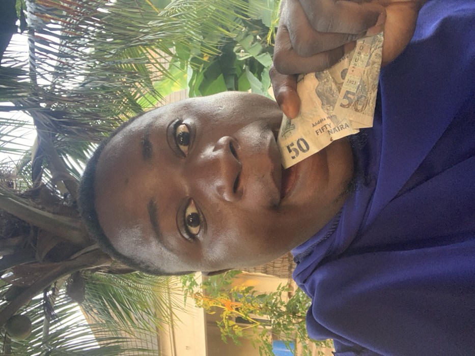 A close-up, outdoor portrait depicts a dark-skinned adult male with short, dark hair and wide-open eyes, looking directly into the camera. He holds several crumpled Nigerian 50 Naira banknotes in his right hand, with one partially inserted into his open mouth. The individual wears a dark blue garment. The background features extensive tropical vegetation, including the trunk and fronds of a palm tree displaying a single green coconut positioned above his head. To the left, a light-colored building and a plant with yellow-orange flowers are visible. The environment is consistent with an outdoor setting in Akwanga, Nigeria.