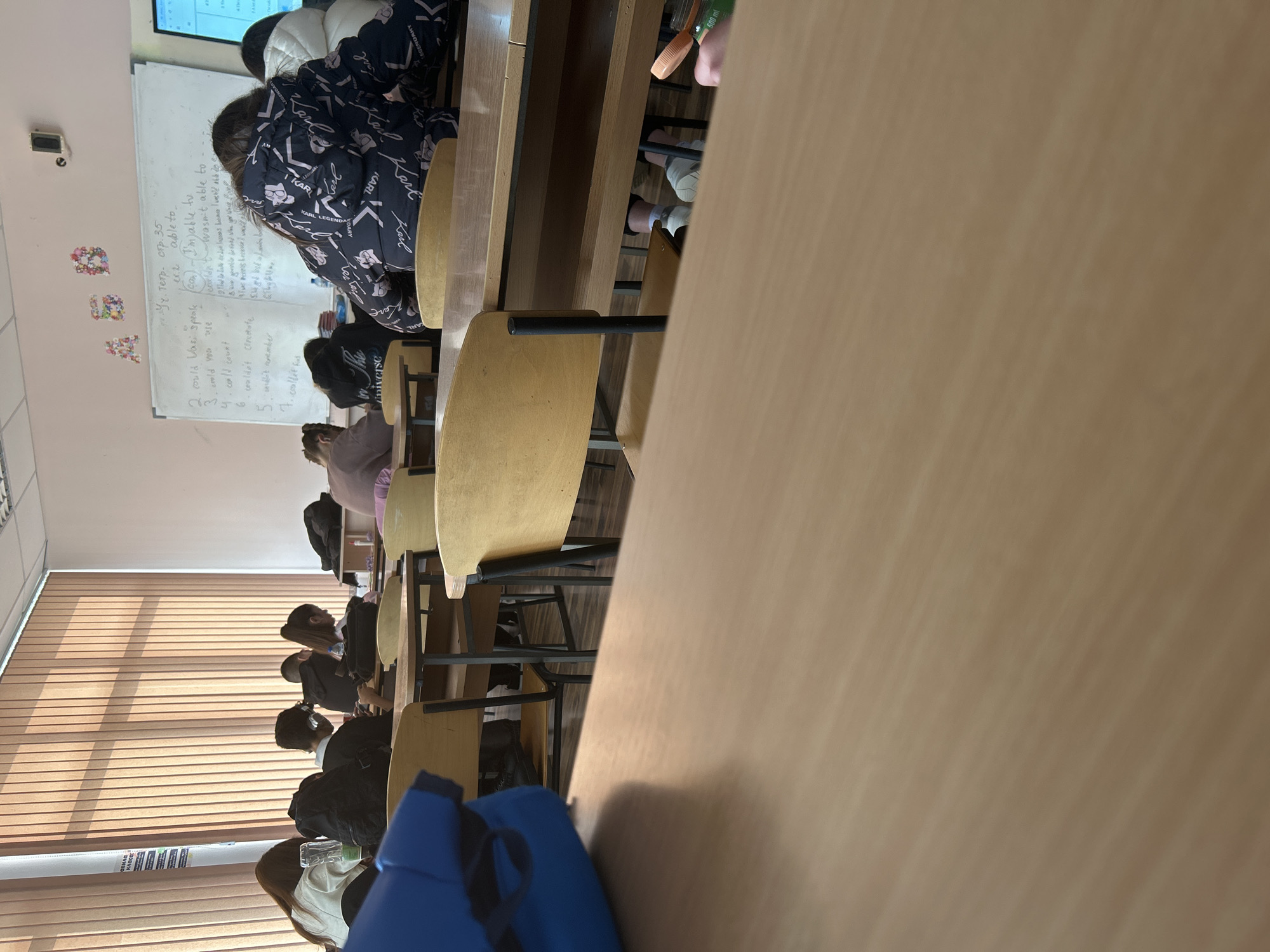 The image depicts an indoor classroom located in Svilengrad, Bulgaria. Approximately ten individuals, appearing to be students, are seated at individual wooden desks with black metal frames, facing forward towards a whiteboard positioned on the rear wall. The classroom features light-colored walls, a wooden parquet floor, and a large window with vertical light-colored blinds on the left side, allowing natural light to enter. On the whiteboard, handwritten text in both Bulgarian and English is visible, including phrases like "could," "able to," and "wasn't able to," indicative of a language lesson. Above the whiteboard, decorative floral letter cutouts (A, B, C, D) are affixed to the wall, along with a small white electronic device, possibly a sensor or camera, mounted higher up. A computer monitor or television screen is visible on a desk in the far right corner. Students are generally engaged, with some observed leaning over their desks, potentially writing or reading. Their attire varies: one student in the right foreground wears a dark blue and black patterned puffer jacket with "Karl" and "Legendary" text, while another behind them wears a white puffer jacket. A student further left wears a light pink top with "universe" visible on the back. Personal items like dark-colored backpacks and clear plastic bottles are present on or near desks. In the immediate foreground, a blue backpack or bag rests on an empty light-wood desk. In the lower right, a hand is visible holding a clear bottle with an orange cap, marked "500 ml." The feet of a student, clad in white socks and light-colored sneakers, are visible beneath a desk.