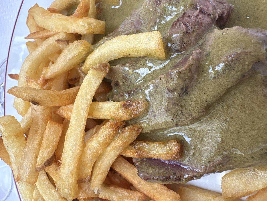 The image displays a close-up, overhead view of a prepared meal consisting of steak frites with a distinctive sauce, served on a white plate with a red rim