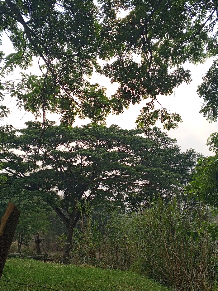 This image depicts an outdoor, natural scene in Los Leoncitos, Venezuela, characterized by dense vegetation under a bright, overcast sky. In the immediate foreground, a strip of vibrant green grass occupies the lower portion of the frame. To the left, a dark brown, vertically oriented wooden post, possibly part of a fence, is partially visible. Running horizontally across the lower midground, a thin, dark line, consistent with a wire fence, can be discerned. To the right of the grass, the foreground transitions into a dense cluster of tall, thin, reedy plants with light green foliage. The midground is dominated by a large, mature tree positioned slightly to the left of the center. This tree features a wide, spreading canopy of dark green leaves and a multi-branched trunk structure. Behind and around this central tree, additional smaller trees and dense green foliage extend across the frame, receding into the background. A faint, light-colored, irregularly shaped object or structure is barely visible in the deep midground, behind the main tree and to its left, consistent with a weathered tree stump or dried wood. The background consists of a continuation of the dense treeline and foliage. The sky, visible through and above the tree canopies, appears bright white to light grey, suggesting either overcast conditions or diffused light. No human figures or discernible animal life are present within the frame, and no specific actions or interactions are depicted. The scene is static, showcasing a verdant, semi-wild environment.
