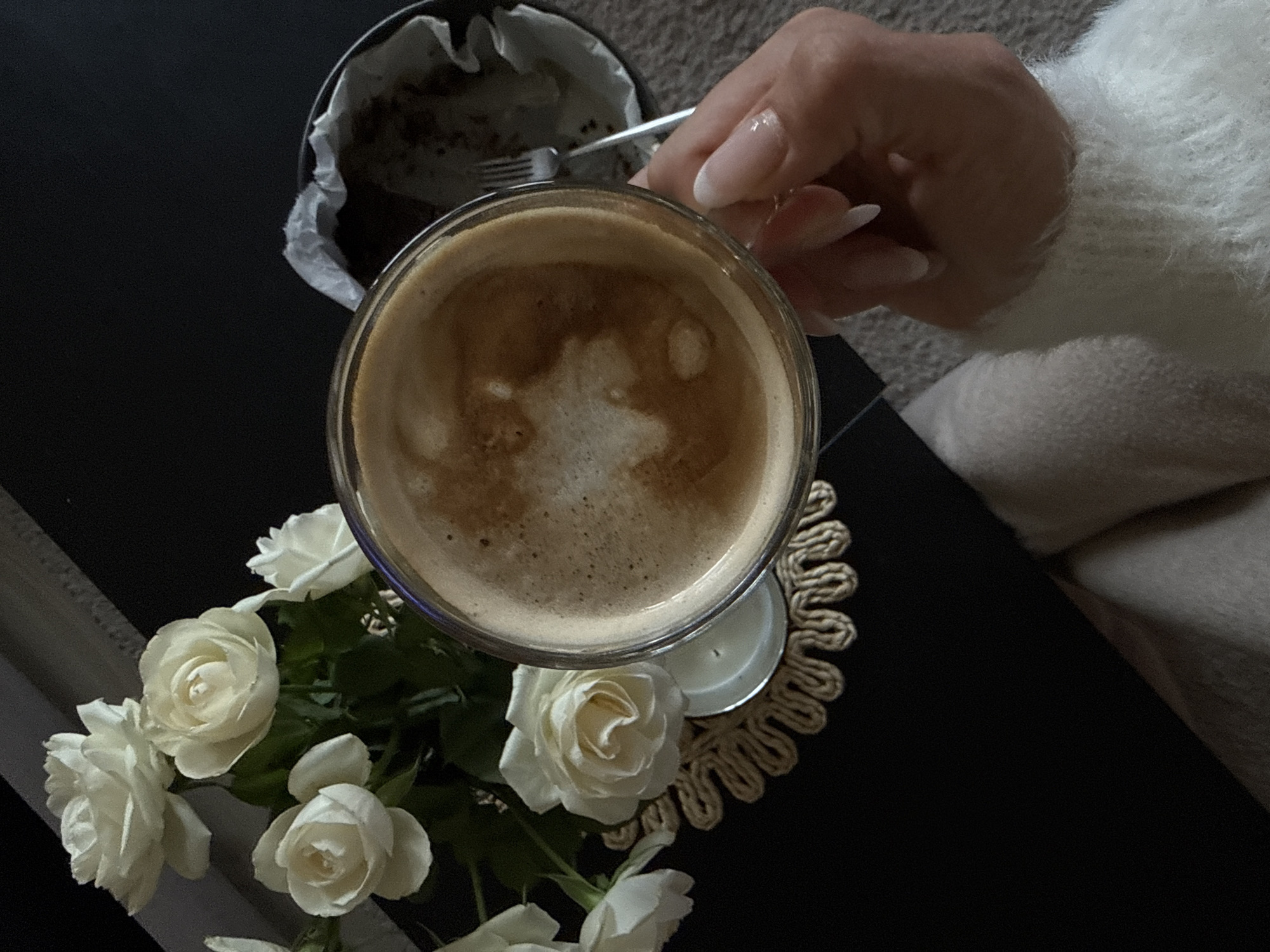 A top-down view shows a glass of coffee with foamy milk on a black surface. To the left, white roses are arranged. Beside the coffee, there is a decorative coaster with a small, unlit candle. In the upper left corner, there is a small, empty cake container with a fork inside. In the upper right corner, a hand with manicured nails holds the coffee glass, wearing a white sweater. The location cannot be determined from this image.