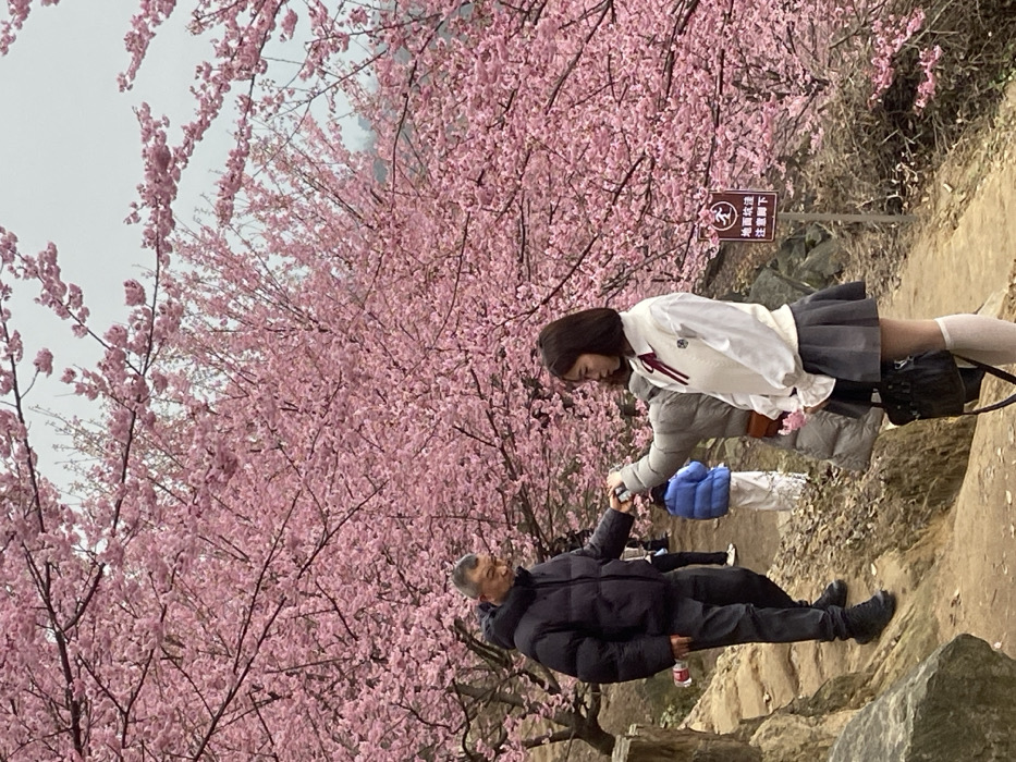 A picturesque scene unfolds beneath a canopy of vibrant pink cherry blossoms. A young woman in a school uniform extends her hand to an older man in a black puffer jacket. Both are positioned on a rocky path, while other people can be seen in the background. The atmosphere suggests a serene and possibly familial connection, set against the breathtaking beauty of nature's springtime display.