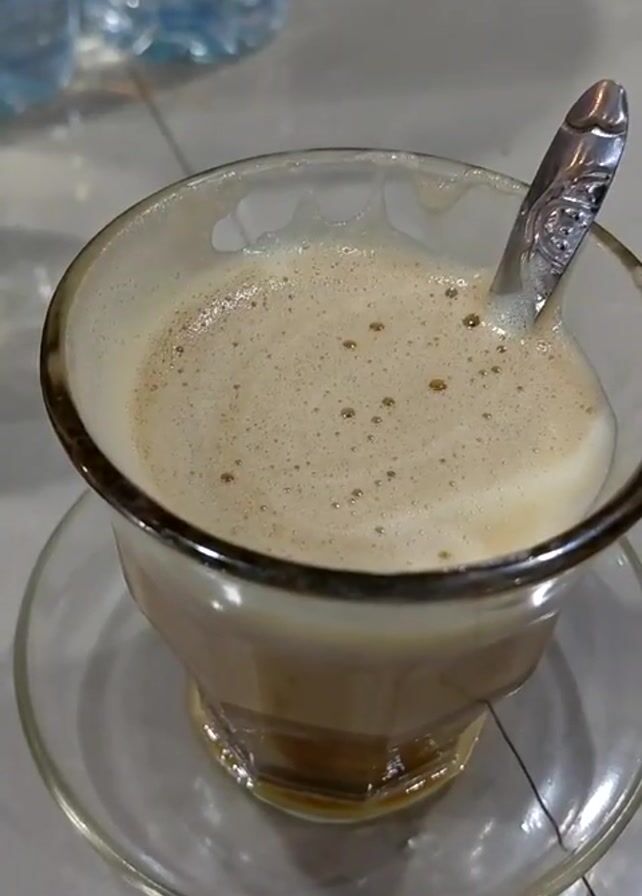 cup of coffee on a saucer. A spoon is in the coffee. There are two bottles of water in the background. The table is white and looks tiled.