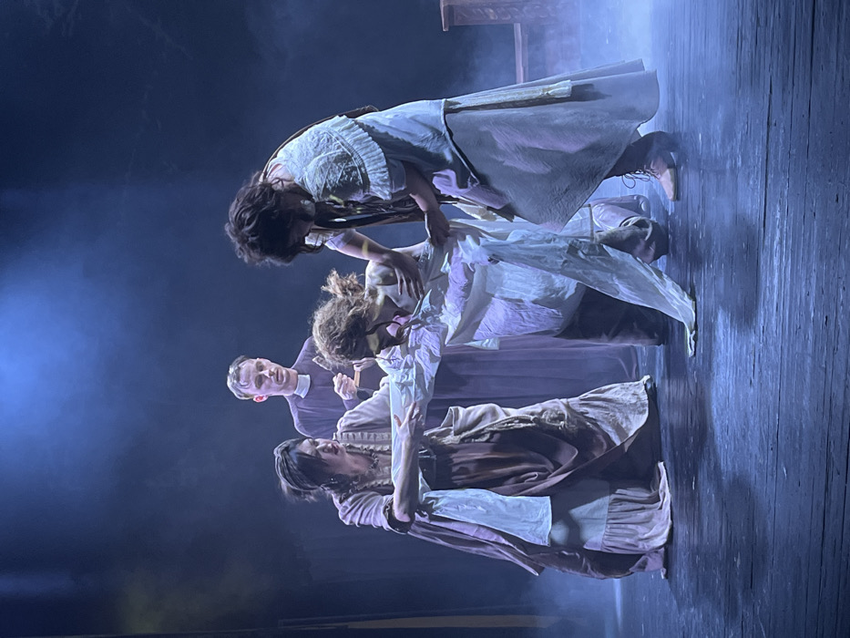 This image captures a theatrical performance on a dark wooden stage, likely at the Novoshakhtinsk Drama Theatre in Novoshakhtinsk, Russia. Four individuals are present under blue-tinted stage lighting enhanced by atmospheric fog. In the central foreground, a female subject is depicted with disheveled dark hair and a dark blindfold covering her eyes. Dark, liquid-like streaks are visible on her face, originating from the blindfold area. She is wearing a light-colored, possibly white, garment and is slightly hunched. To the immediate left of the central figure, a woman in a long, muted reddish-brown dress with a lighter-colored overskirt or apron actively holds a length of white fabric draped around the central subject. Her dark hair is styled away from her face, and her expression is focused. Behind and slightly to the right of the central figure stands a male subject, identified by a dark clerical robe and a white Roman collar. He has short, light-brown hair and holds a small, light-colored object, consistent with a religious artifact, in his right hand, observing the scene. To the right of the central figure, a second woman with disheveled dark hair is present. She is dressed in a long, light-colored, possibly white or cream, dress featuring an embroidered bodice and a dark sash. She supports the central figure by holding her right arm. The interaction indicates the three surrounding individuals are engaged with or attending to the central female figure. A dark, wooden stage prop is partially visible on the far right side of the stage.