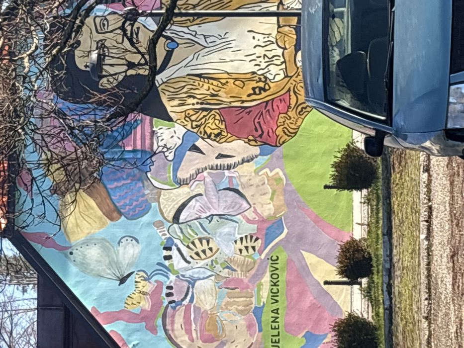 The image displays a vibrant mural on the exterior wall of a building in Cetinje, Montenegro. The mural, signed "JELENA VICKOVIC" in the lower-left corner, features a stylized portrait of a man with dark hair and a mustache on the right side, wearing a white garment and a yellow, intricately patterned jacket with black outlines. Black drip-like elements extend downwards from his eyes. A blue medallion or gem is visible on his neck. The central and left portions of the mural are composed of abstract, colorful shapes, including a large white butterfly, two smaller yellow-and-black patterned butterflies, and various pastel-colored forms resembling fabric or organic elements against a light blue, pink, and lime green background. The building wall has a dark-colored roofline visible at the top. A bare deciduous tree with numerous dark branches partially obscures the upper right section of the mural, including part of the man's head. In the foreground, a light blue vehicle is parked, with its front passenger side, windshield, and a portion of the hood visible, partially obscuring the lower right of the mural. Below the mural, a narrow strip of ground with several small, dark green spherical shrubs is present, bordered by what appears to be a concrete curb. The immediate foreground shows a gravel or unpaved surface. The scene is illuminated by natural daylight. This mural is located on the side of the Old Government Building (Stara Zgrada Vlade) in Cetinje, which currently houses the Faculty of Fine Arts (FLU).