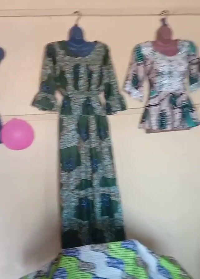 interior of a small room, likely a tailor's shop. On the wall, there are three dressmaker's dummies and finished clothing items on hangers. There's a long dress and a top. A sewing machine table with a stack of materials sits in a corner. A black bag and a beige bag are stacked on top of the sewing machine. A calendar hangs on the wall. A pink balloon is attached to the wall by the dressmaker's dummy. The ceiling has simple white beams. The overall impression is that this is a basic, functional workspace.