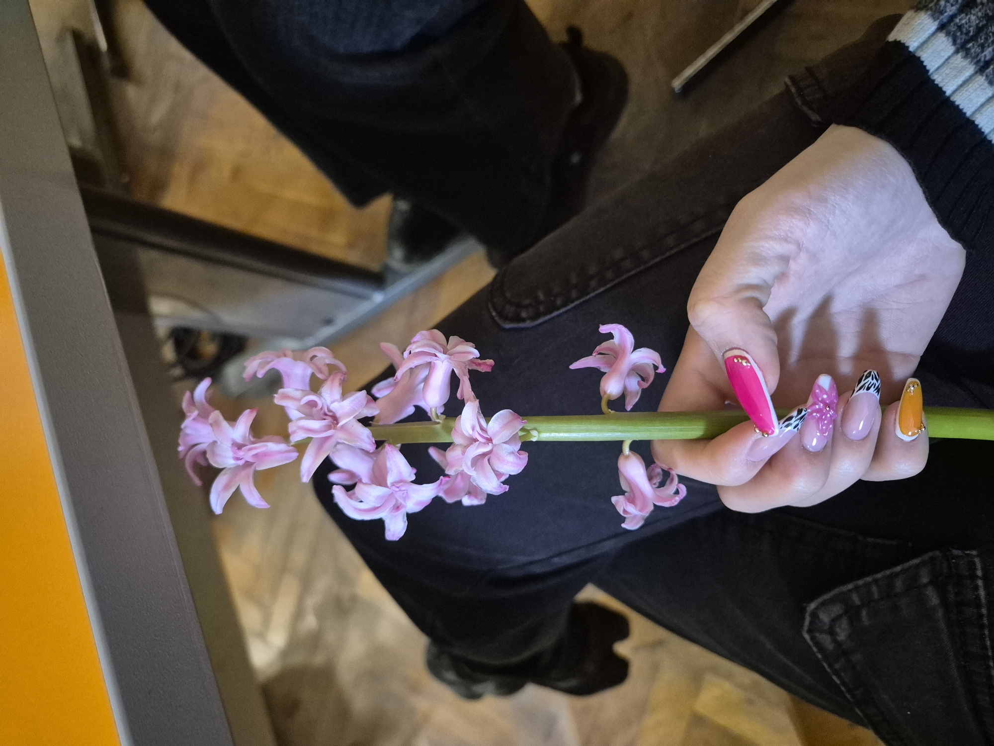 A person sitting on a chair is holding a stem of pink hyacinth flowers with their right hand. The person is wearing black jeans and a black and white striped sweater. The background appears to be indoors, with a wooden floor and an orange panel. The location is not specified and cannot be determined solely from the image, therefore, it cannot be verified as Pavlikeni, Bulgaria.
