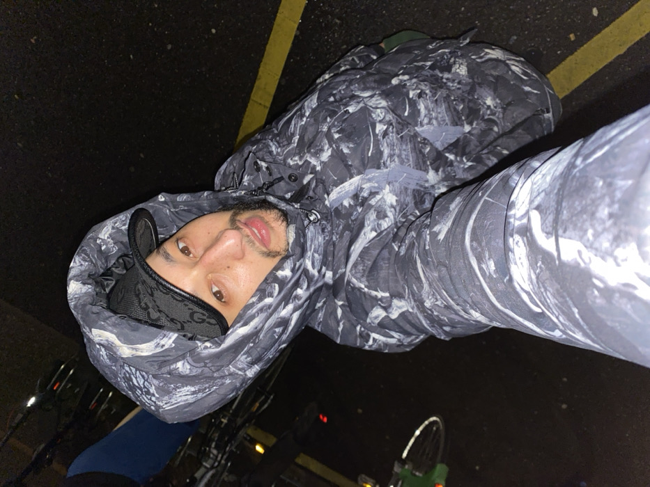 A person wearing a gray and white marble-patterned hooded jacket and a black cap with a Gucci print is featured in a tilted, low-angle shot. The individual has brown eyes and a dark beard. The background consists of a dark paved surface with a yellow line and indistinct bicycle frames. The scene appears to be dimly lit.