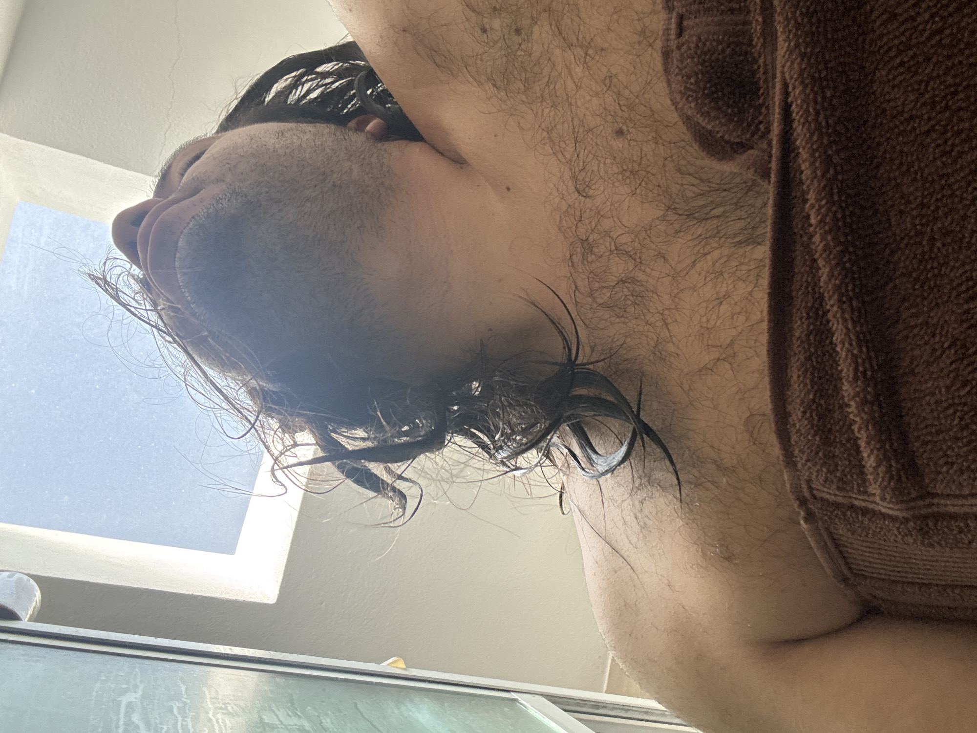 An adult male is captured from a low-angle perspective, looking upwards, within an indoor environment located in San Juan Cuautlancingo, Mexico. The male subject exhibits dark, wet, shoulder-length hair and light facial stubble on the chin and jawline. Moderate body hair is present on the visible upper chest and right shoulder. A brown terry cloth towel is wrapped around the lower torso. Overhead, a square skylight is prominent in a white ceiling, providing bright natural illumination from a clear blue sky. To the left of the frame, a vertical frosted or translucent glass panel is partially visible, likely a component of a shower stall or room divider. The surrounding interior structures, including walls and ceiling, are uniformly white or off-white.