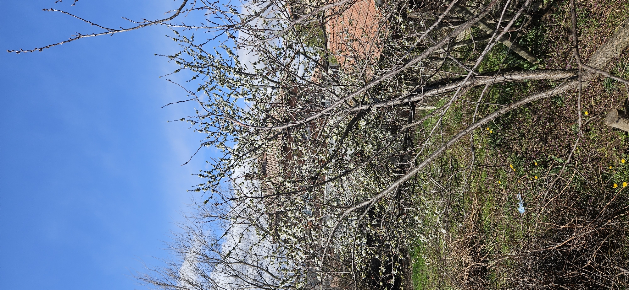 view of a tree with white blossoms against a blue sky and a building with a reddish-brown roof. The tree's branches are bare except for the blossoms, indicating early spring. The ground is covered with green grass and other vegetation, interspersed with fallen branches. The building appears to be residential, and the location is likely Blagoevgrad, Bulgaria.