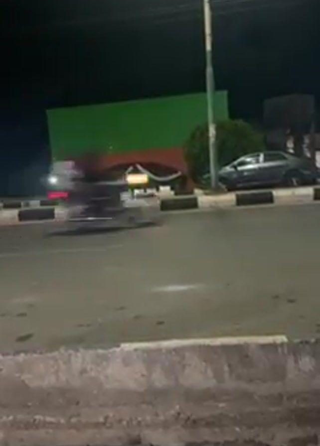 car performing a donut in the middle of a road at night