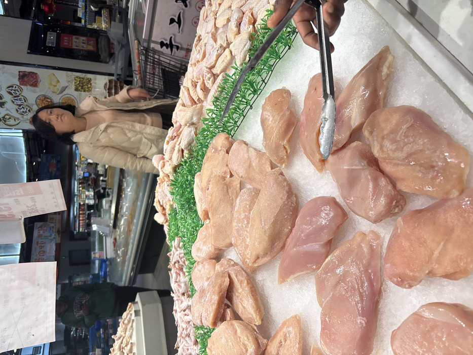 This image depicts the fresh meat section of a supermarket in Jiangjin, China